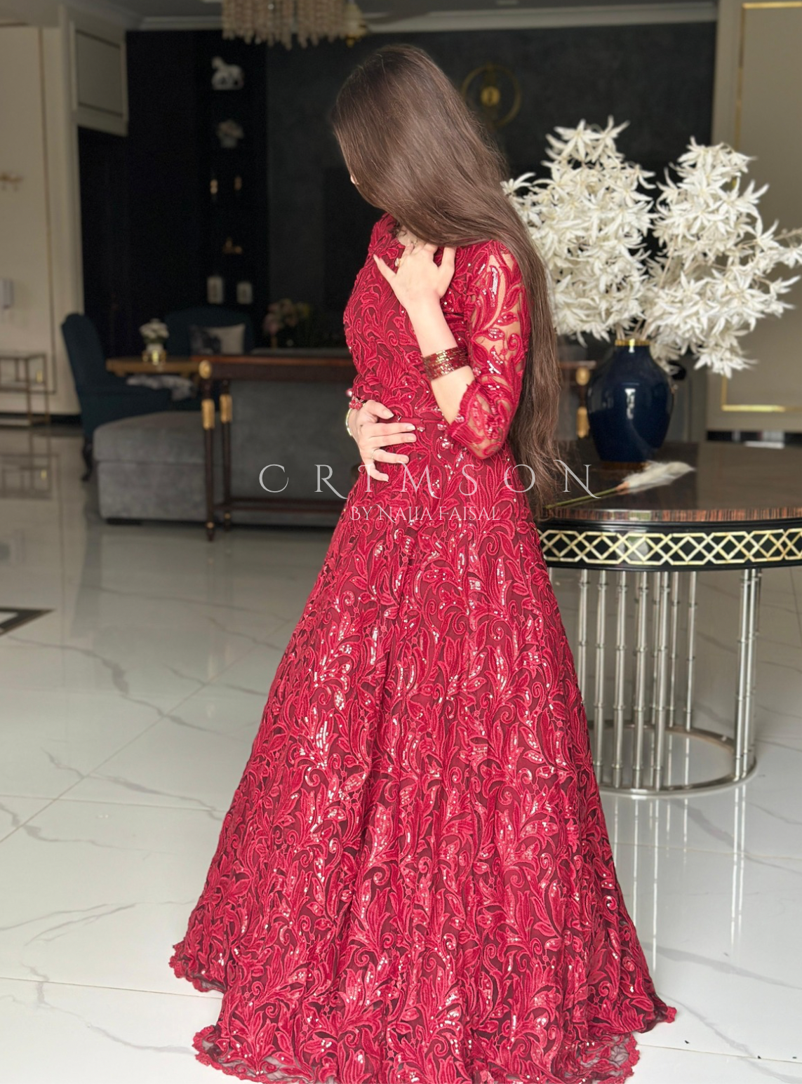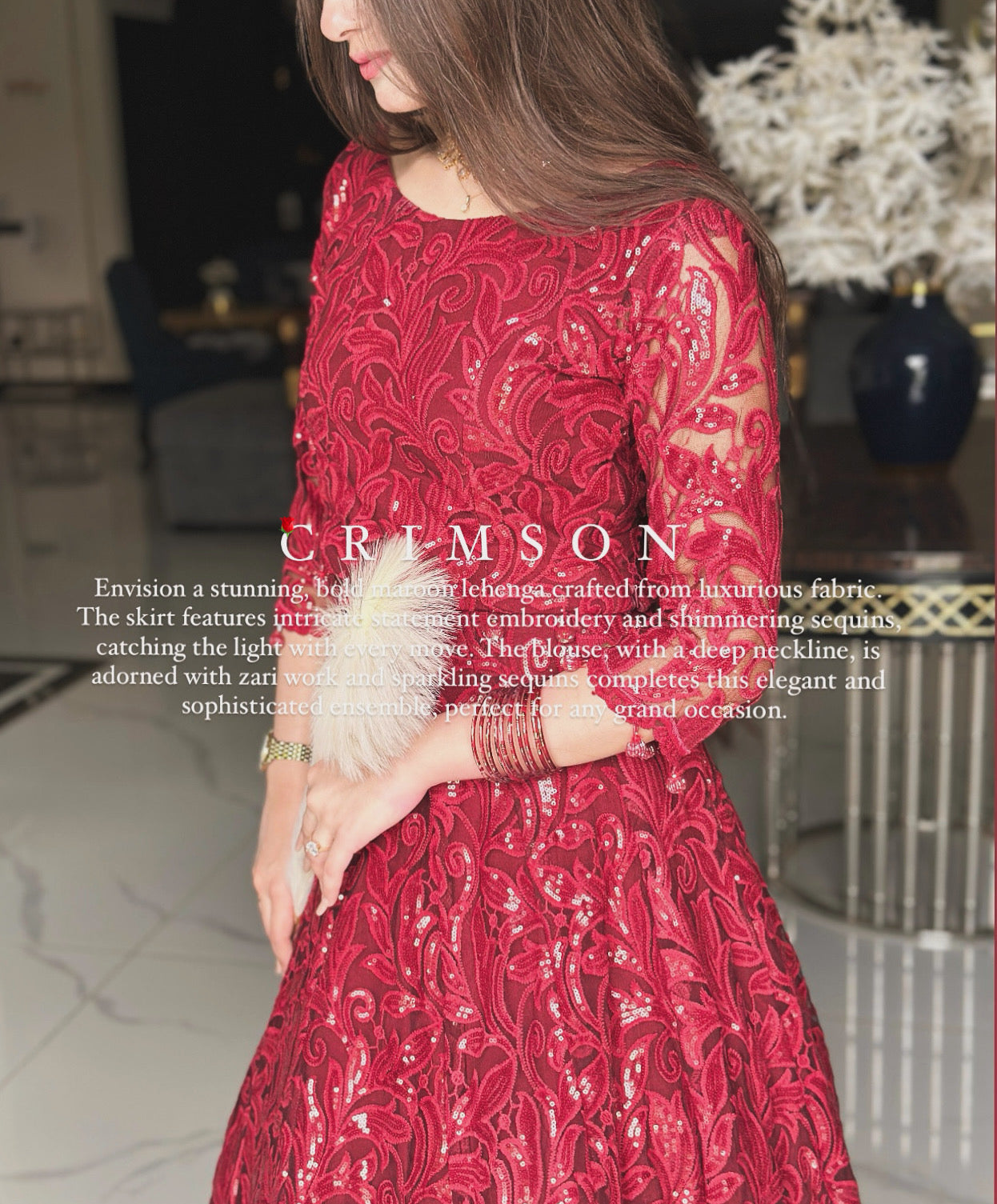 Envision a stunning, bold maroon lehenga crafted from luxurious fabric. The skirt features intricate statement embroidery and shimmering sequins, catching the light with every move. The blouse, with a deep neckline, is adorned with zari work and sparkling sequins completes this elegant and sophisticated ensemble, perfect for any grand occasion.
