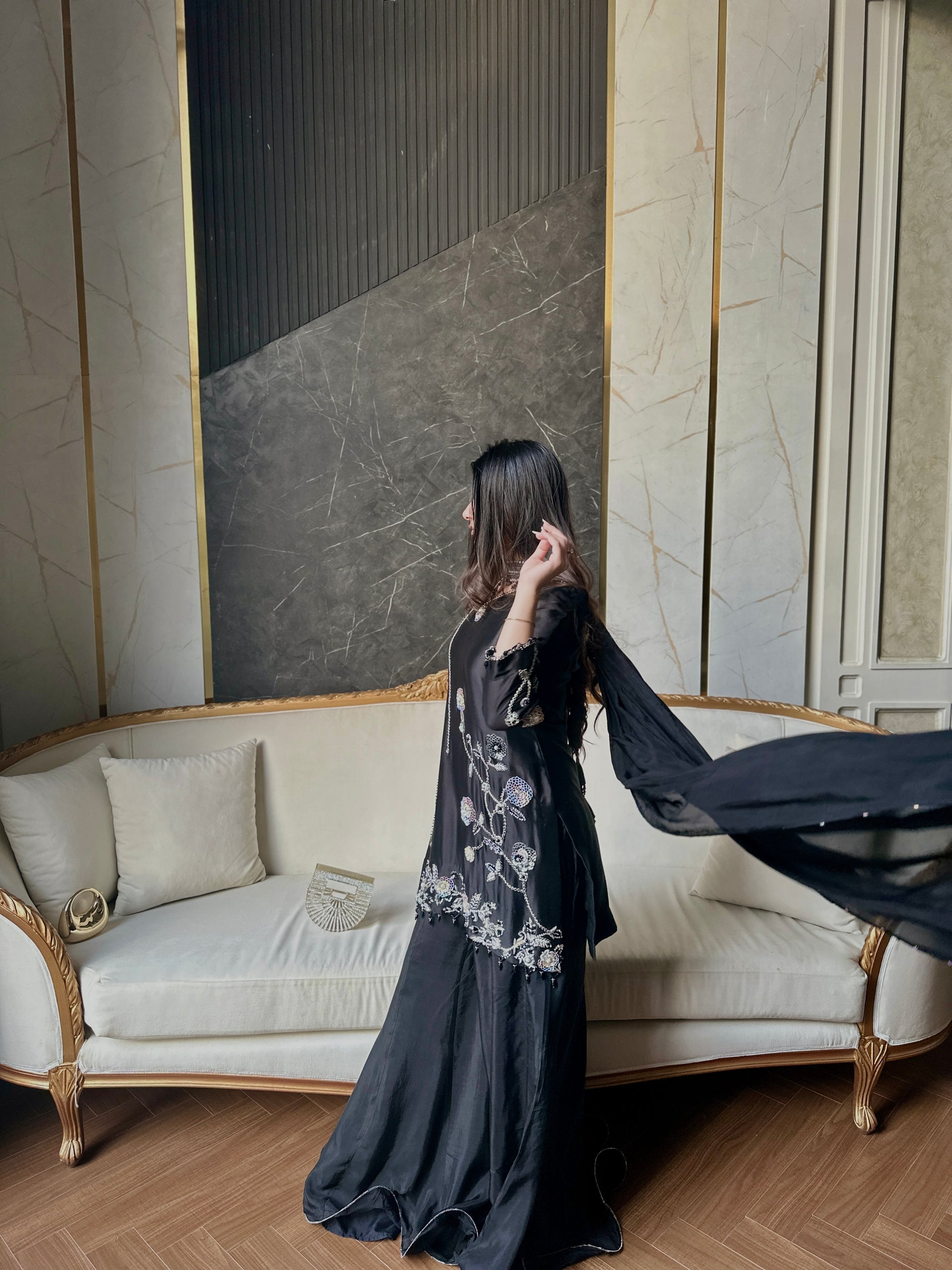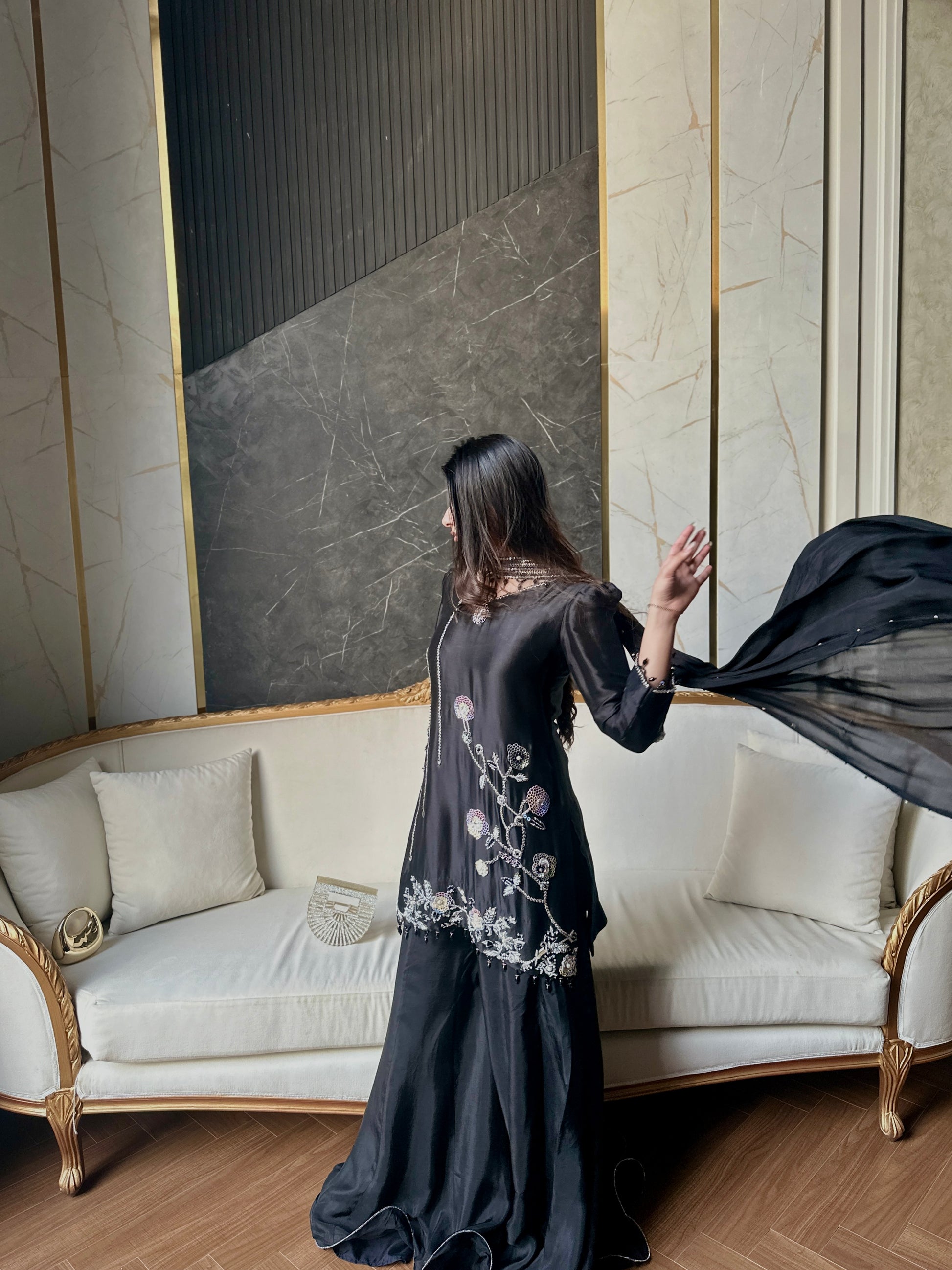 KOEL- This elegant three-piece ensemble exudes timeless sophistication with its jet-black base and delicately detailed embellishments. The long, flowy shirt crafted from luxurious sheesha silk features intricate floral embroidery in silver and pastel tones, adorned with subtle bead and sequin work along the hem and sleeves. Paired with wide-legged sharara-style pants in medium silk, the outfit creates a graceful silhouette that moves beautifully with every step. The sheer medium silk dupatta adds a soft, ethereal touch, completing the look with understated elegance. Perfect for evening occasions or festive gatherings, this outfit blends traditional artistry with a contemporary edge, making it a statement piece of refined beauty.
