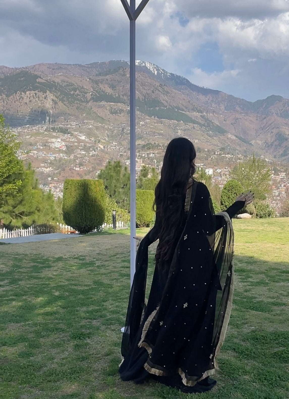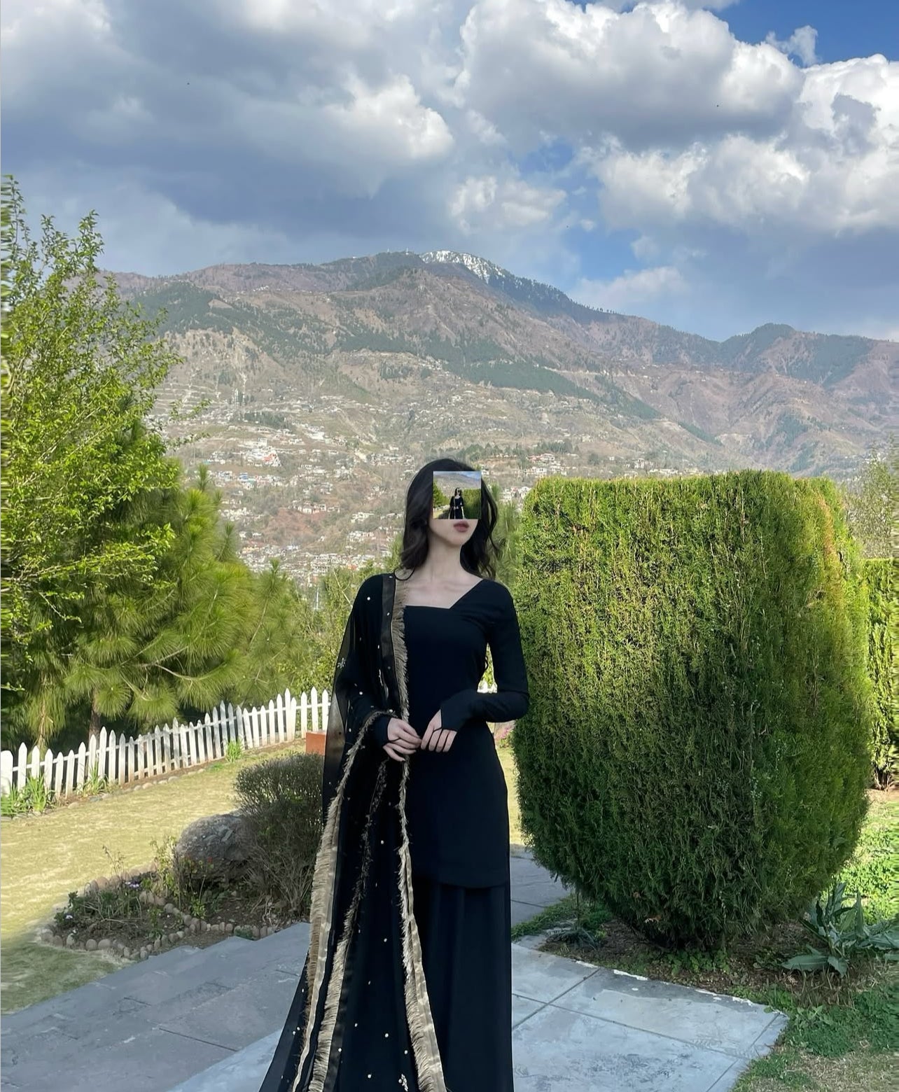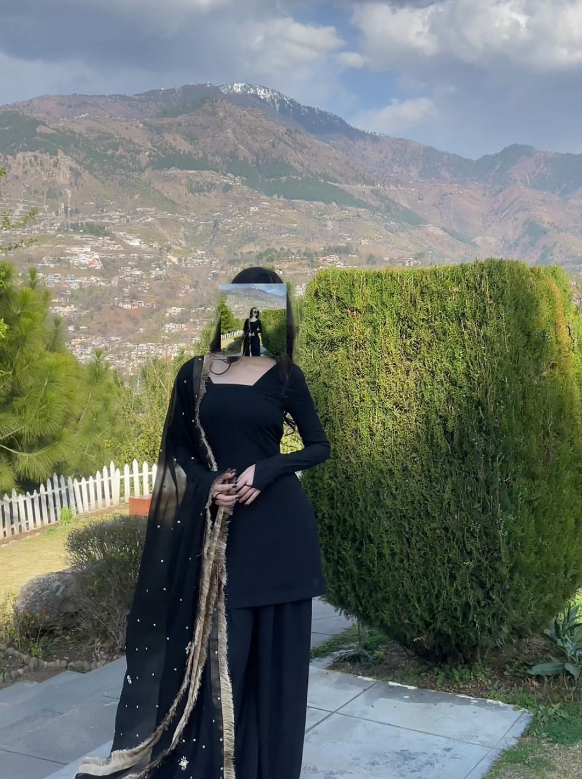 a stunning black traditional Pakistani ensemble that exudes elegance and grace. It features a fitted kameez with full sleeves and a modern square neckline, offering a sleek and sophisticated silhouette. Paired with wide-legged bottoms, the look maintains a timeless appeal. The dupatta adds a touch of glamour with its sheer black fabric, delicate embellishments, and gold fringe detailing along the borders, perfectly balancing simplicity with festive charm. Set against a scenic mountain backdrop, the outfit stands out beautifully, making it ideal for formal occasions or cultural celebrations.