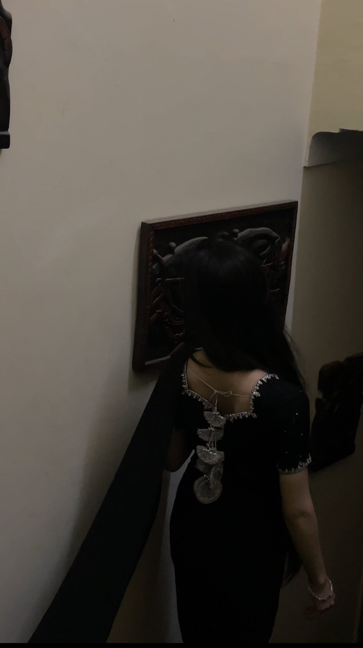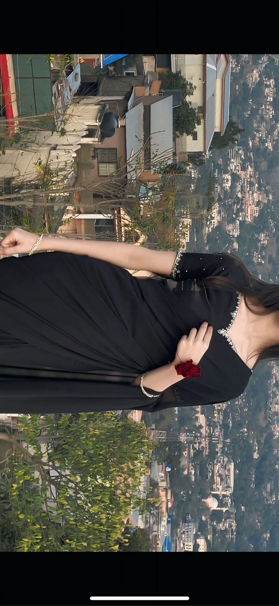 The saree is a plain black fabric, offering a sleek and timeless look. The blouse is crafted from a black fabric as well, featuring embellished, shimmery details that add a touch of glamour. The blouse is intricately decorated with silver handwork, likely in the form of fine embroidery or sequins, enhancing the overall elegance and giving it a sophisticated, luminous appeal. The combination of the plain saree and the detailed blouse creates a balanced yet striking ensemble.