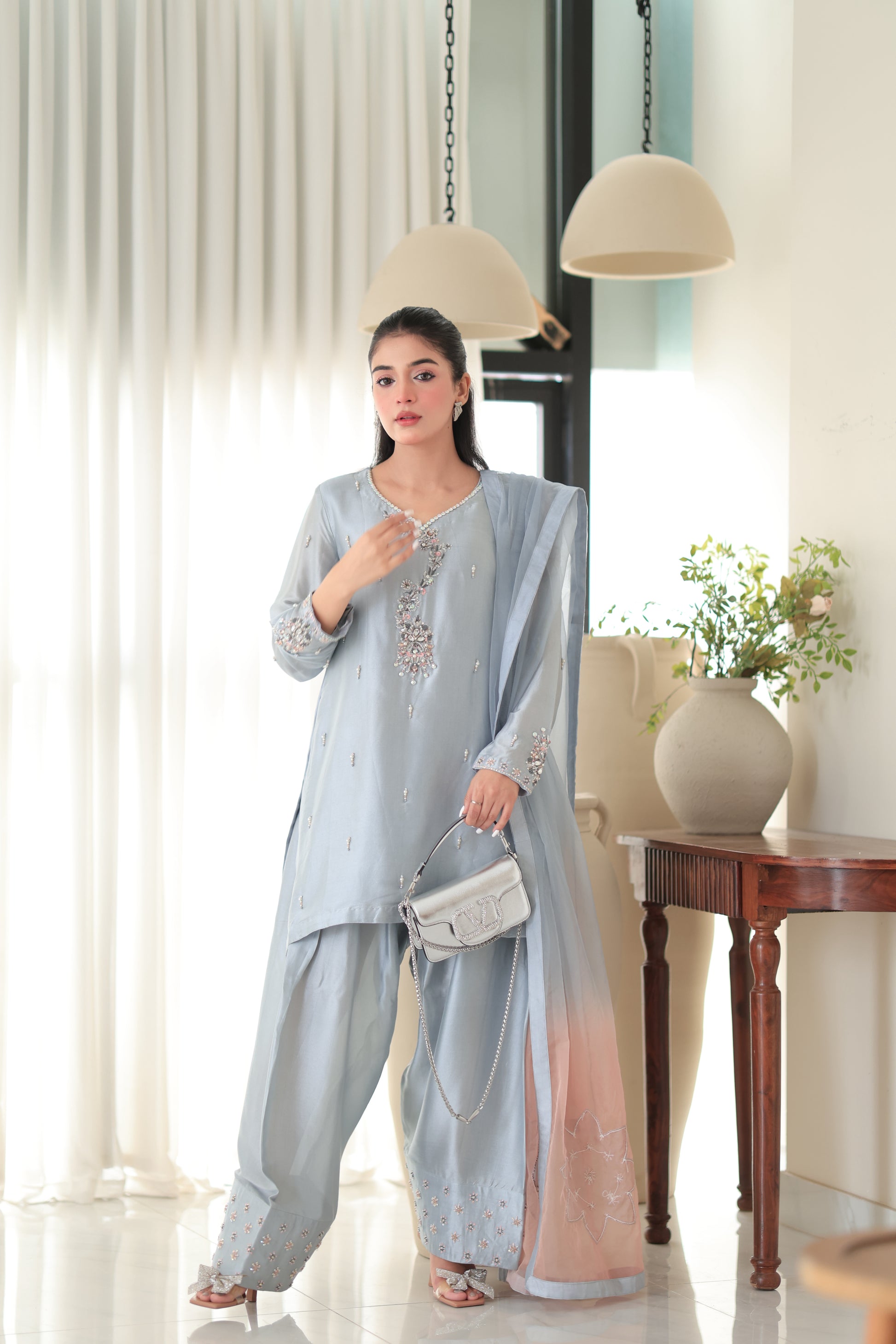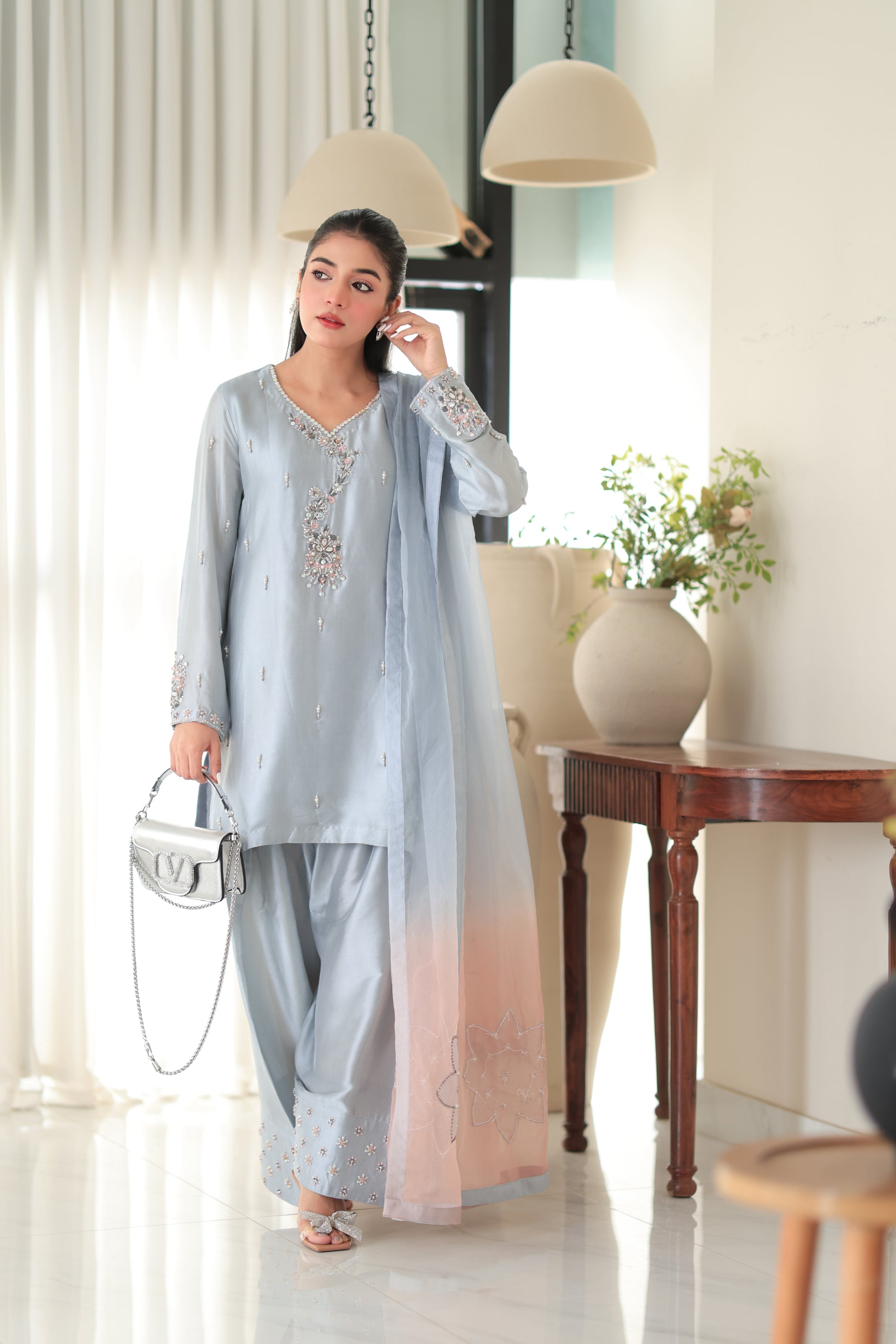 This exquisite Farshi Shalwar suit is a perfect blend of elegance and tradition, crafted in a soft pastel blue/silver hue with a lustrous fabric that drapes beautifully. The kurta features delicate hand embroidery with zari, resham, and sequin work, adorning the neckline and extending gracefully onto the sleeves, where the cuffs are further embellished for a regal touch. The farshi-style shalwar, with its wide-legged, floor-grazing silhouette, is adorned with floral embroidery and subtle beadwork, adding depth and sophistication. Complementing the outfit is a sheer ombré dupatta, transitioning from silver to a warm peach tone, with intricate floral embroidery and a soft shimmer that enhances its ethereal charm. This ensemble is perfect for weddings, festive occasions, or formal gatherings, exuding grace when styled with embellished heels, a statement clutch, and traditional jewelry.