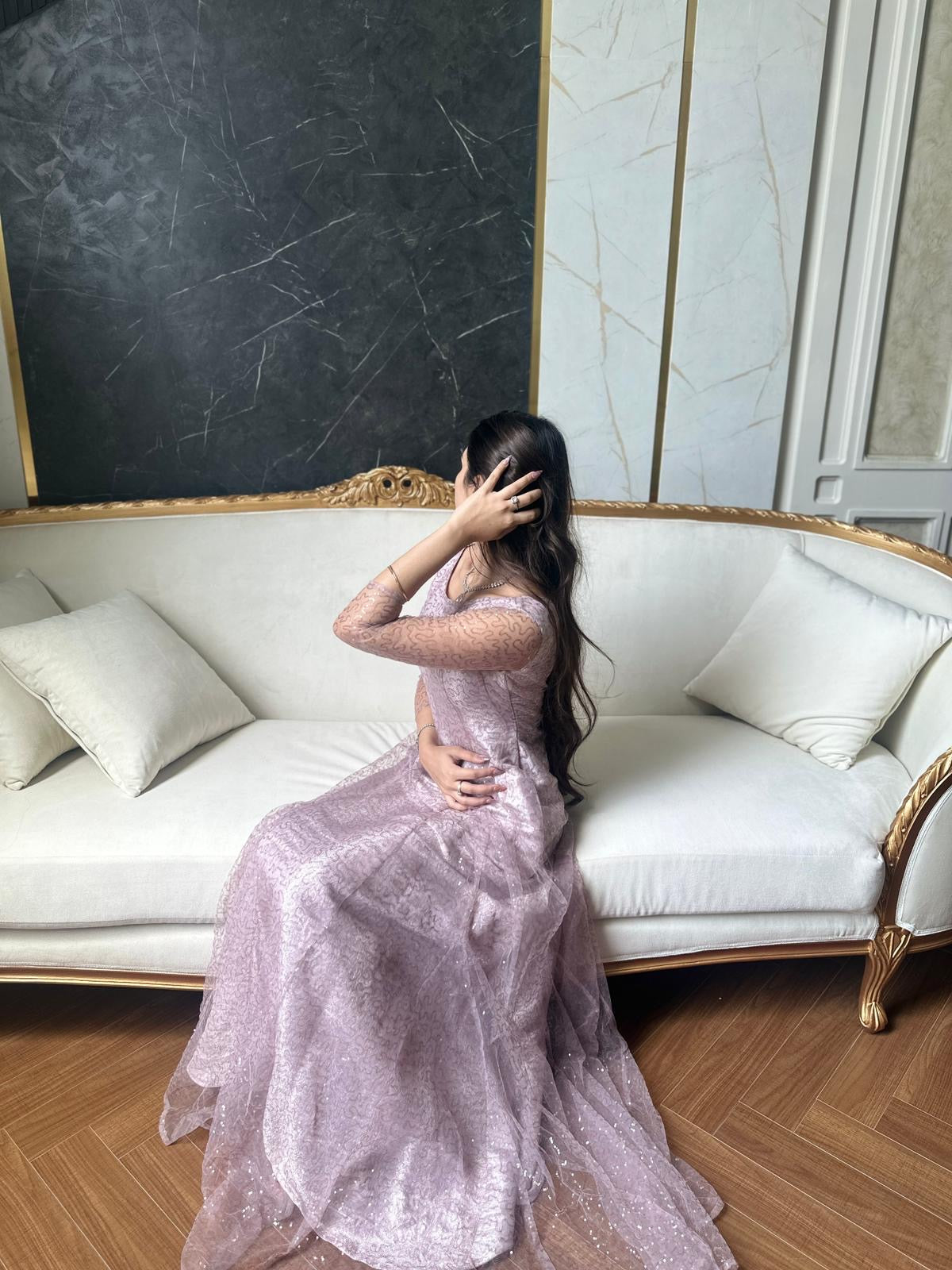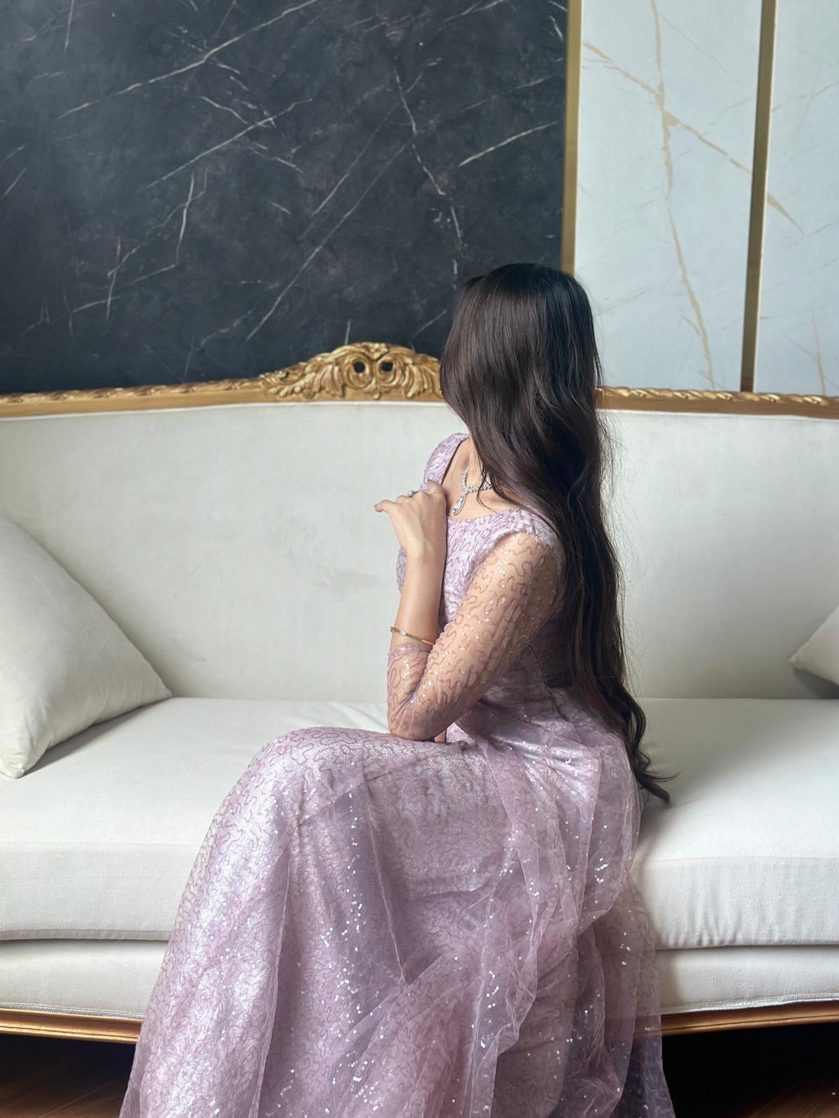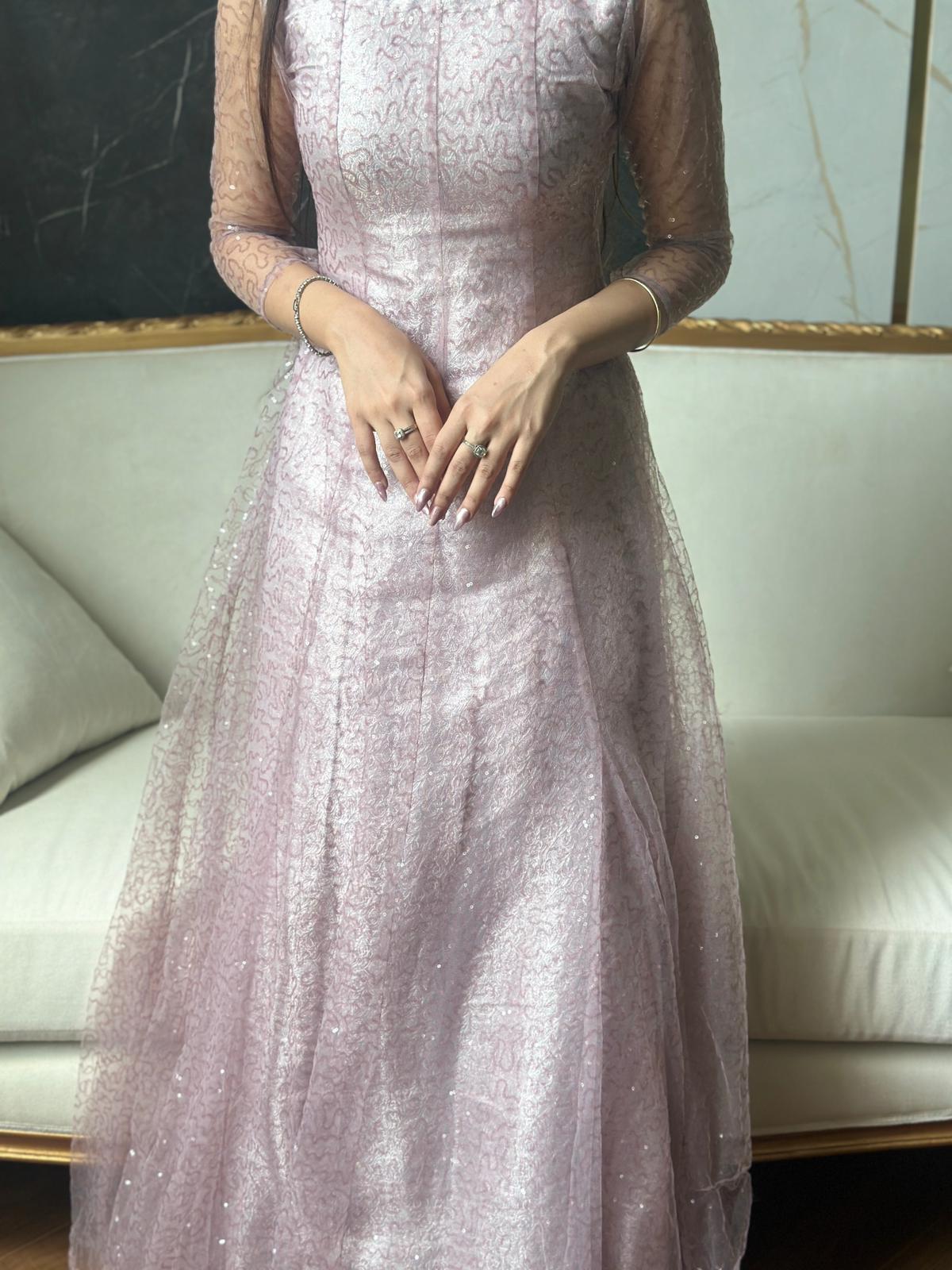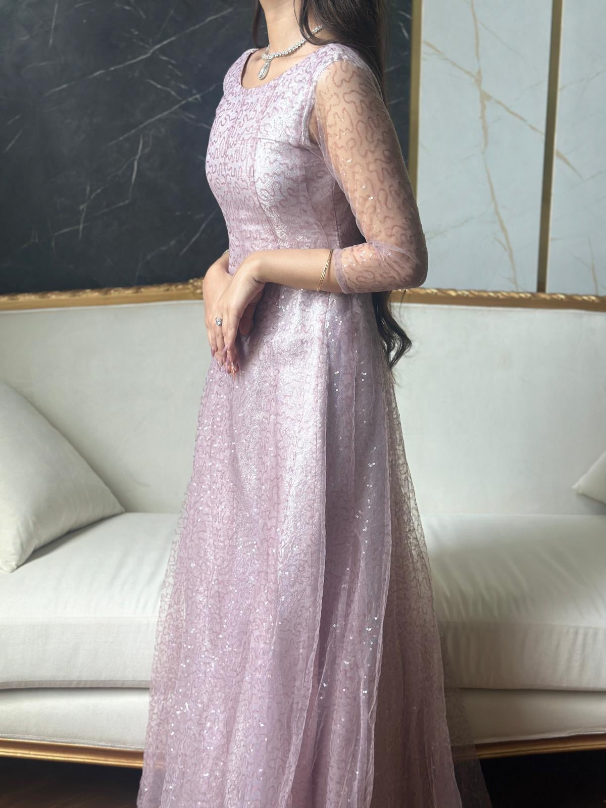 “Elegance in Lavender: A stunning lace gown that effortlessly blends modern charm with timeless sophistication. Perfect for those moments when you want to feel both graceful and glamorous.”
